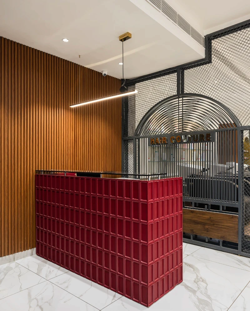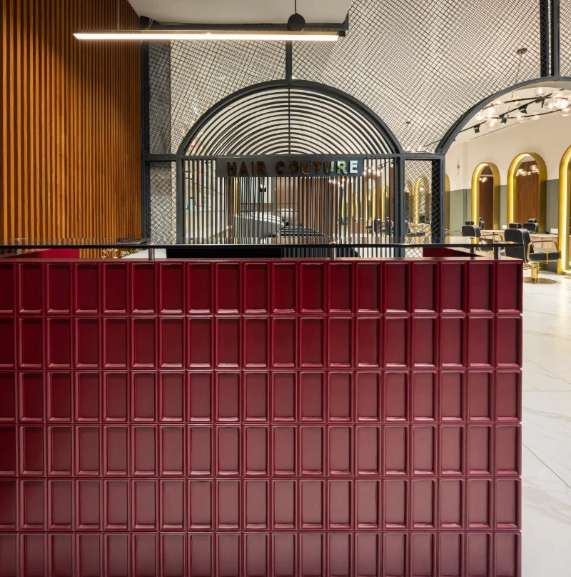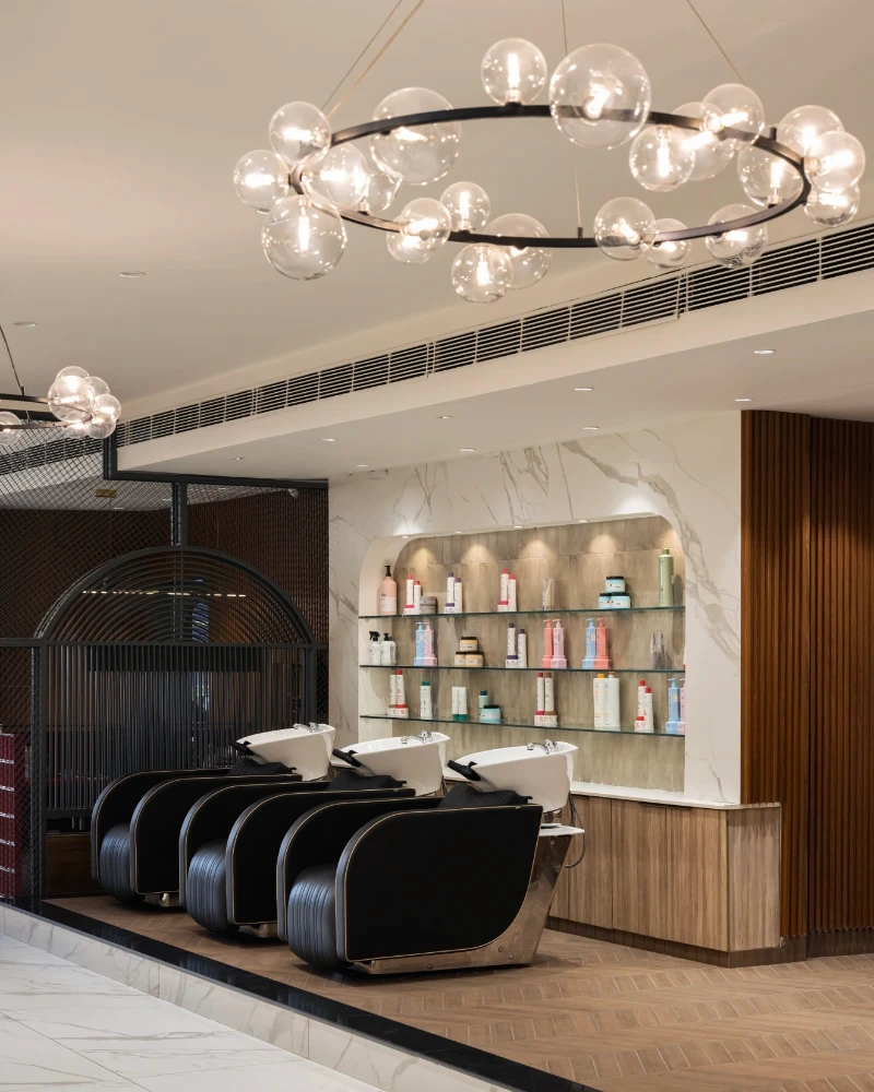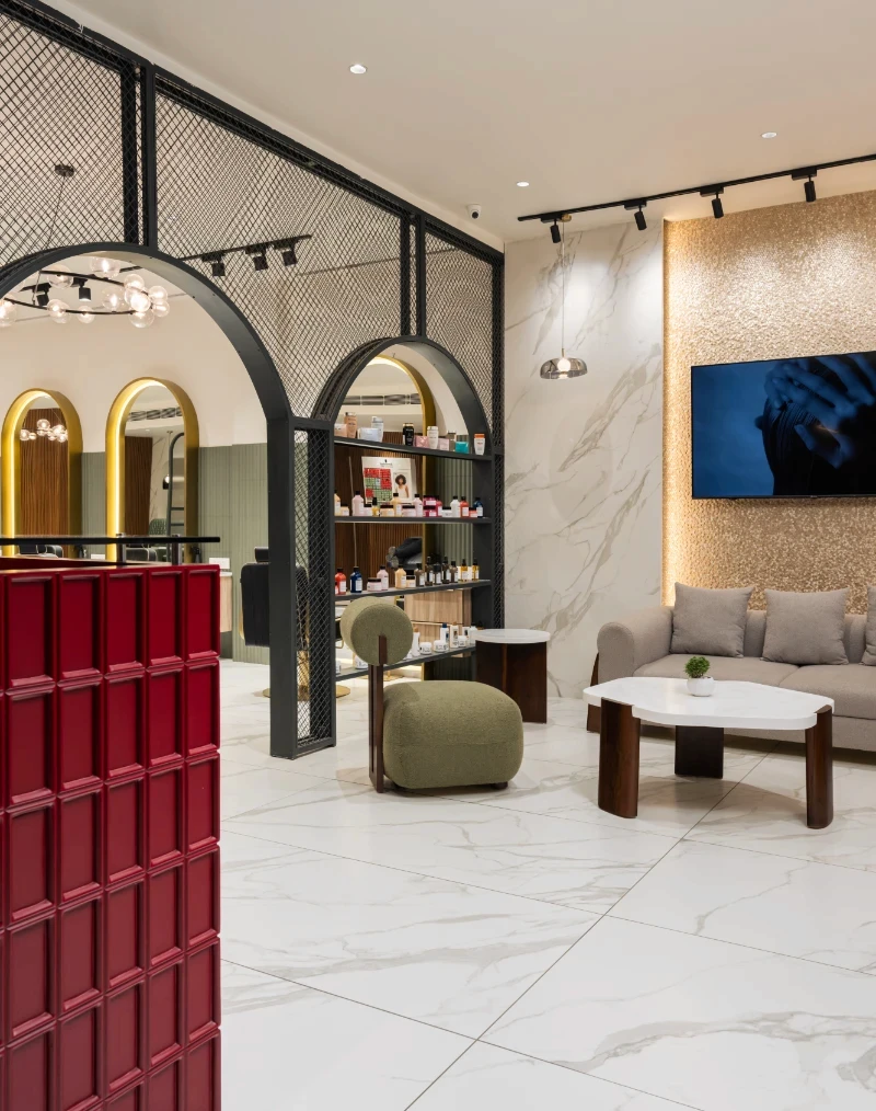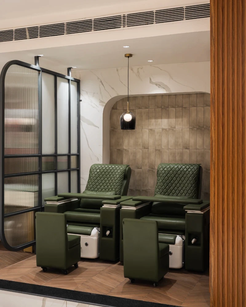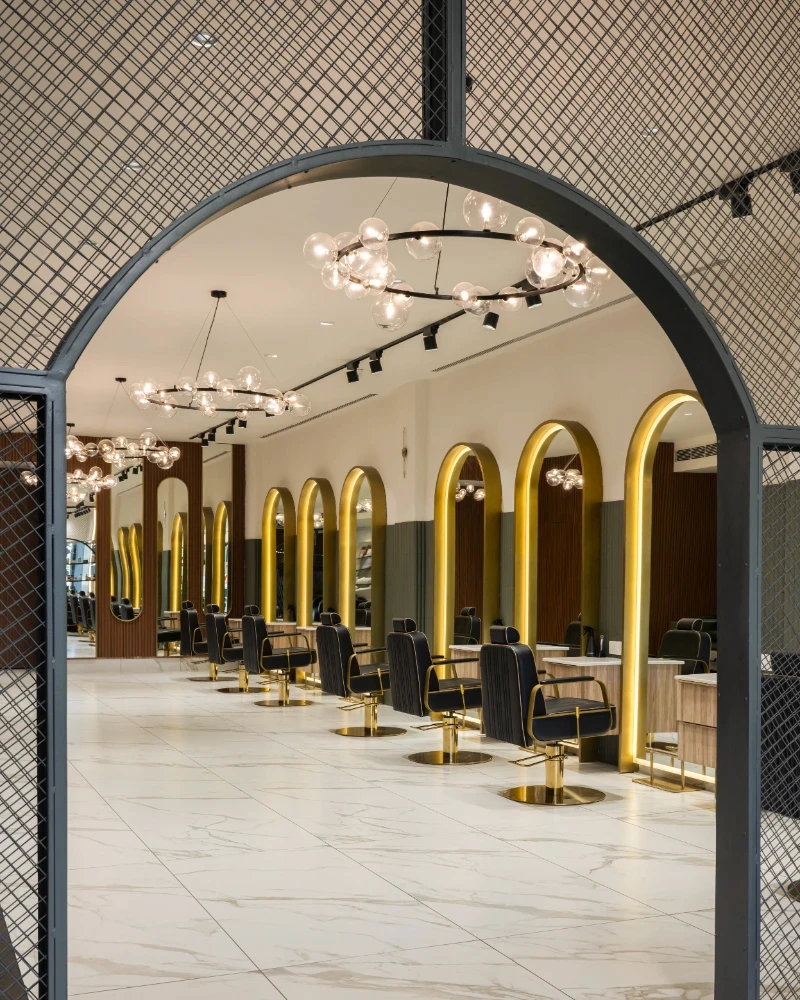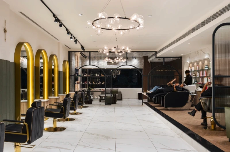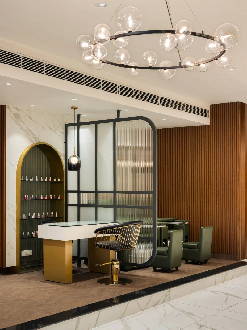 Conceptualisation: The concept was to achieve a design that effortlessly blends modern luxury with a warm, inviting atmosphere, keeping in mind the same, the layout is meticulously planned. With clearly defined zones for each service, ensuring both privacy and a seamless flow for clients. Reflective mirrors throughout amplify the sense of space and light, while well-lit display shelves beautifully showcase products, maintaining an organized and pristine environment. Material and design: Material selection is crucial in a highly functional and activity-exposed place like a salon. Adhering to the functional requirements of the space, materials like natural wood tones that harmonise with sleek marble accents with elegant arches and intricate jali partitions add a touch of timeless sophistication & were decided upon to be focal parts of the project. Statement bubble chandeliers emitted a soft, graceful glow, enhancing the upscale ambience without overwhelming the senses. Custom-designed furniture, including plush green leather chairs and gold-accented tables, infuse the space with subtle luxury and comfort. Incorporating thoughtful touches like curved niches, frosted glass partitions, and gold metal accents, along with ergonomically designed stations, elevates the overall client experience, ensuring the salon is not only visually striking but also highly functional and user-centric. This careful attention to detail makes every visit feel both luxurious and effortless