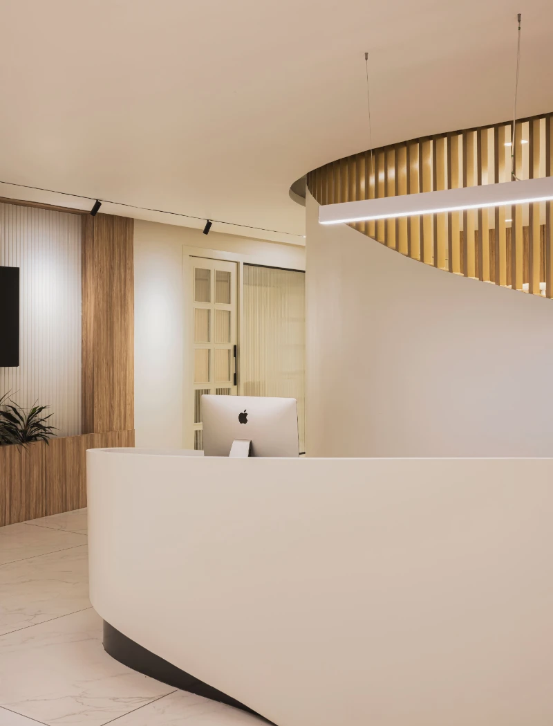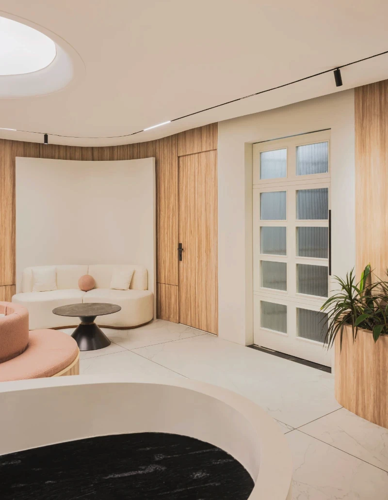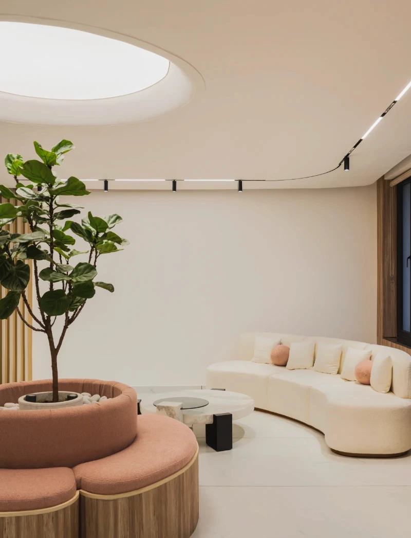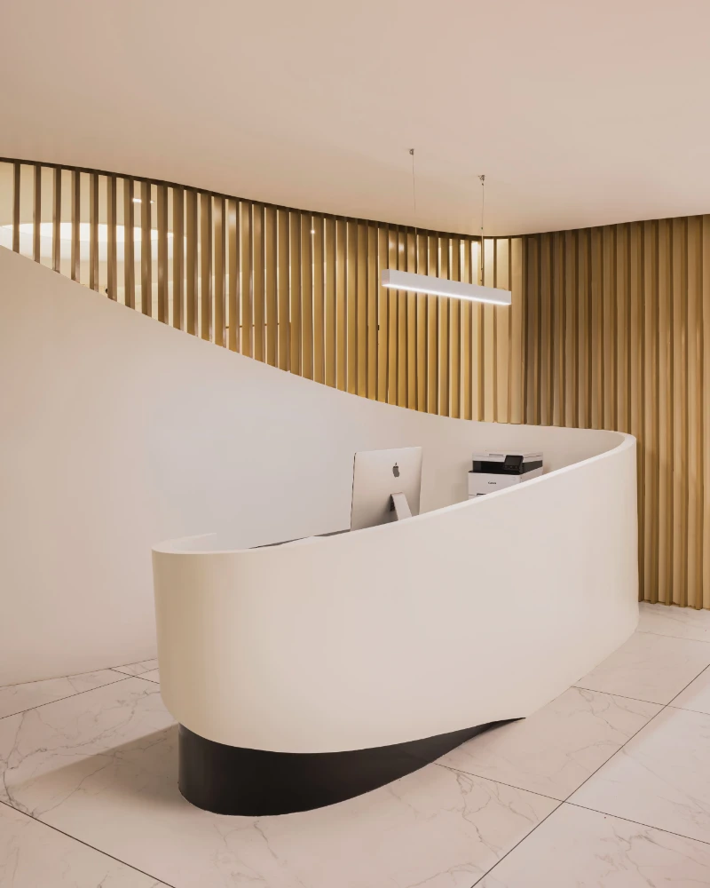 The Smile Designers clinic aims to break away from the typical sterile, rectangular designs often associated with medical spaces, creating a more welcoming and unconventional environment. The concept focuses on blending form and function to design a space that feels comfortable and playful while maintaining its purpose as a healthcare facility. Curved walls, flowing spaces, and the use of natural elements shape the clinic’s unique aesthetic. A key feature of the design is the stretch ceiling, which resembles a large skylight, bringing natural light into the space and filling it with an airy ambiance. This ceiling element is likened to a moon crater by the clients, adding a touch of whimsy. Minimal materials were chosen to keep the design elegant and functional, with sleek duco and veneer finishes on the