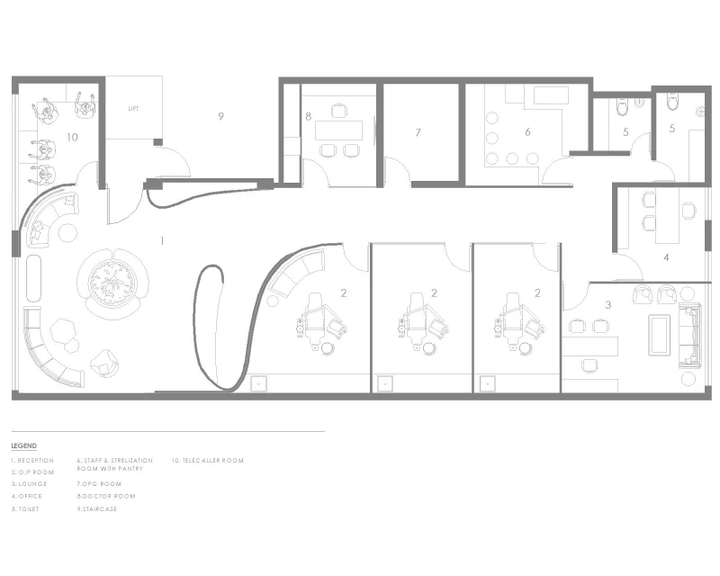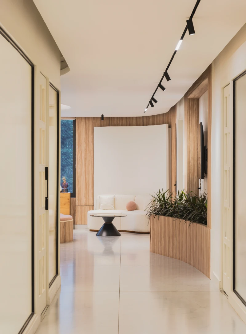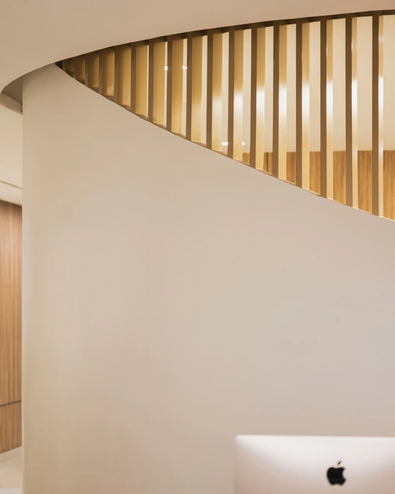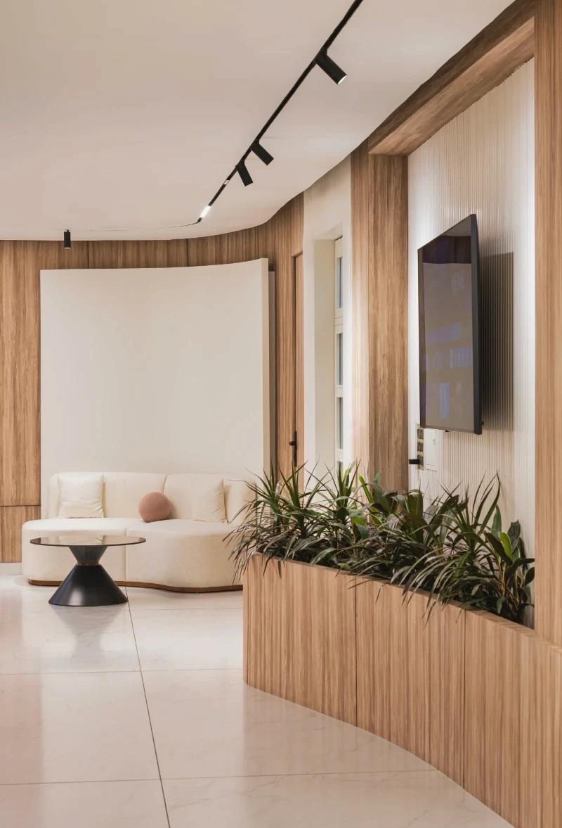 The Smile Designers clinic aims to break away from the typical sterile, rectangular designs often associated with medical spaces, creating a more welcoming and unconventional environment. The concept focuses on blending form and function to design a space that feels comfortable and playful while maintaining its purpose as a healthcare facility. Curved walls, flowing spaces, and the use of natural elements shape the clinic’s unique aesthetic. A key feature of the design is the stretch ceiling, which resembles a large skylight, bringing natural light into the space and filling it with an airy ambiance. This ceiling element is likened to a moon crater by the clients, adding a touch of whimsy. Minimal materials were chosen to keep the design elegant and functional, with sleek duco and veneer finishes on the